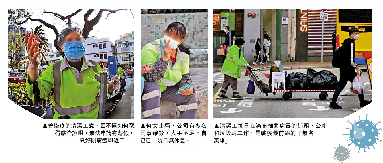 (大公報記者 盛德文、調查組)戶外清潔工每日走在滿布細菌病毒的街頭、公廁和垃圾站工作,是嚴峻疫情下最危險的工種之一。大公報記者近日實地直擊多區清潔工的苦況,當中不少是白髮長者,也有染疫剛癒為餬口而「頂硬上」復工的老婦,惹人憐憫。